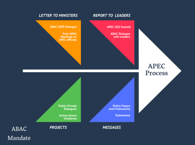 Every year, ABAC submits a Report to APEC Leaders which outlines key recommendations focused on regional economic integration. ABAC also engages with Ministers, especially those responsible for Trade, Finance, SME, Energy, Food Security, Health, and Women to address urgent challenges.